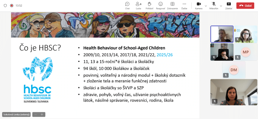 V menších skupinách a v rúznych tématických oblastiach hľadáme najvhodnejšiu podobu dotazníka, ktorým v školskom roku 2025/2026 plánujeme mapovať zdravie a so zdravím súvisiace správanie školákov vo veku 11 až 15 rokov v ich sociálnom kontexte. Bude ich približne 10 000 na Slovensku a viac ak pol milióna na severnej pologuli!